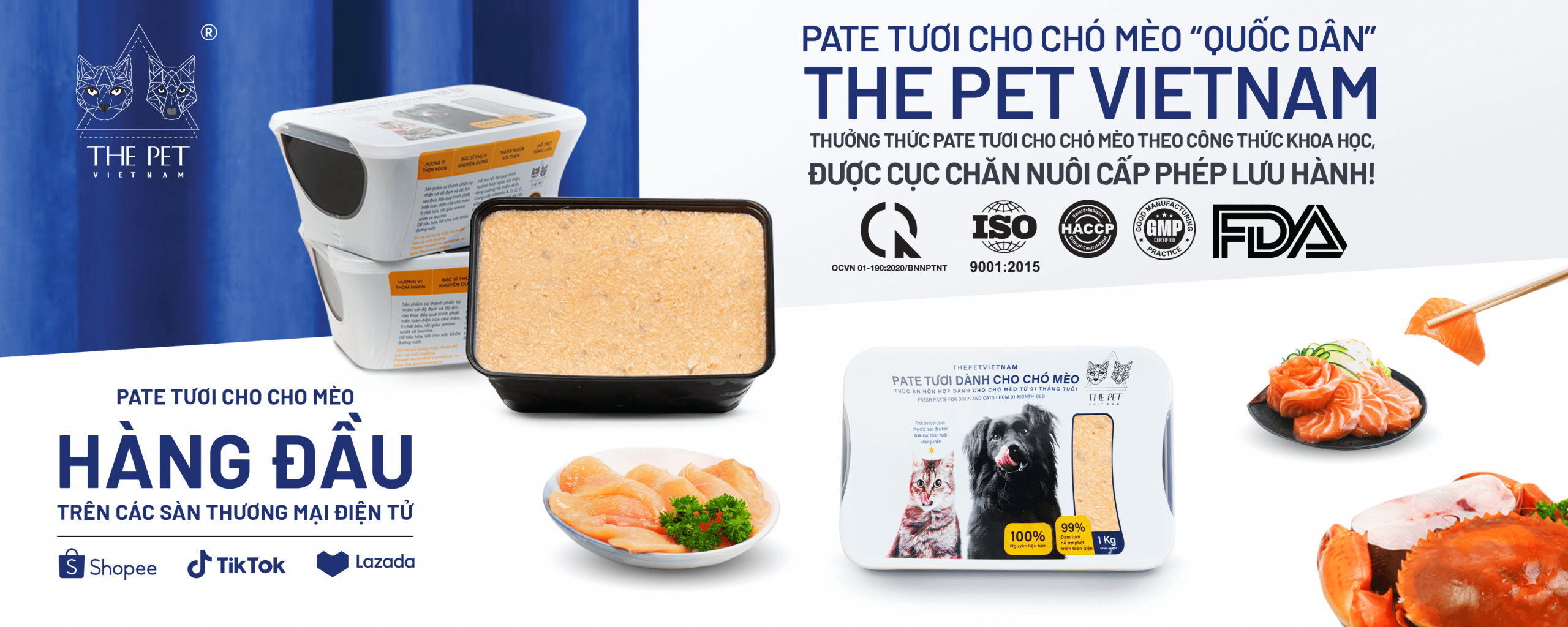 Thức ăn tươi dạng pate do The Pet Vietnam phân phối là sản phẩm đẩu tiên có nguyên liệu 100% cá, thịt tươi, bổ sung vitamin & khoáng chất dùng trong thú y đặc trị cho các boss biếng ăn, đang cần phục hồi sau bệnh, đang mang thai, giúp giảm rụng lông, đẹp da & chắc khỏe xương.