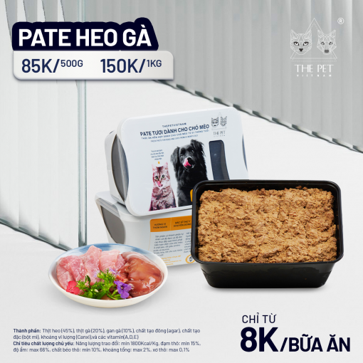 Thành phần: Thịt heo 40%, thịt gà 15%, gan gà 15%, chất tạo đông (agar), chất tạo đặc (bột mì), khoáng vi lượng (Canxi), và các vitamin (A,E,D)