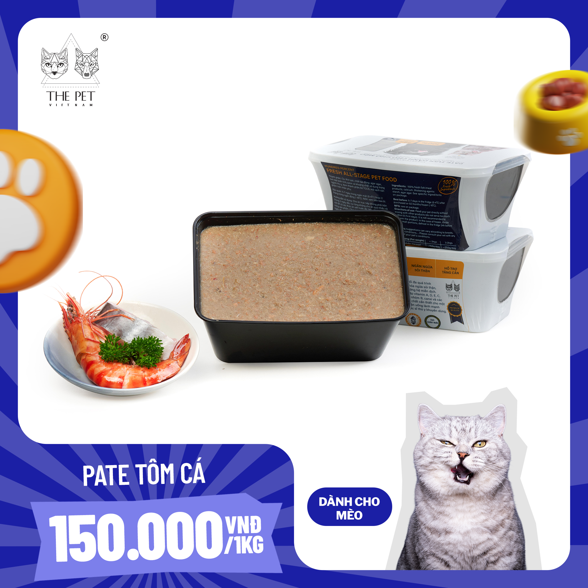 Được làm từ cá biển tươi đánh bắt ở vùng biển miền Nam Việt Nam, hầm nhừ cùng với tôm tươi mọng đến từ vùng nuôi trồng trù phú sông Cửu Long, mỗi thìa pate tươi mát là kết quả của sự chọn lọc tinh tuý từ nguyên liệu và sự thấu hiểu nhu cầu dinh dưỡng của mèo. Sản phẩm là Best-Seller thích hợp cho mèo ở mọi giai đoạn. | The product is made from the freshest ocean fish fillet caught from the South Coastline of Vietnam, braised for a long time with freshest prawn from Mekong Delta cultivation areas. Every spoon of the fresh paste is the product of sorting the ingredients and understanding the needs your cats. The product is OUR BEST-SELLER and suitable for all cats.